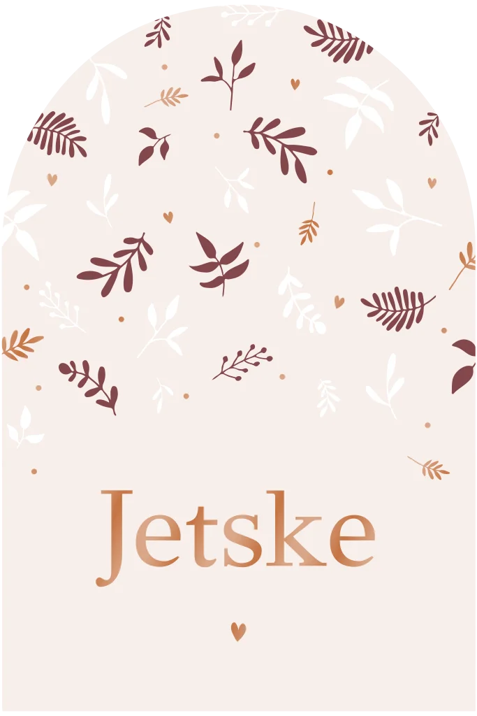 Een enkel geboortekaartje in een leuke boogvorm. Op de voorkant heeft het kaartje verschillende blaadjes en takjes en het kaartje is aan allebei de kanten afgewerkt met koperfolie.