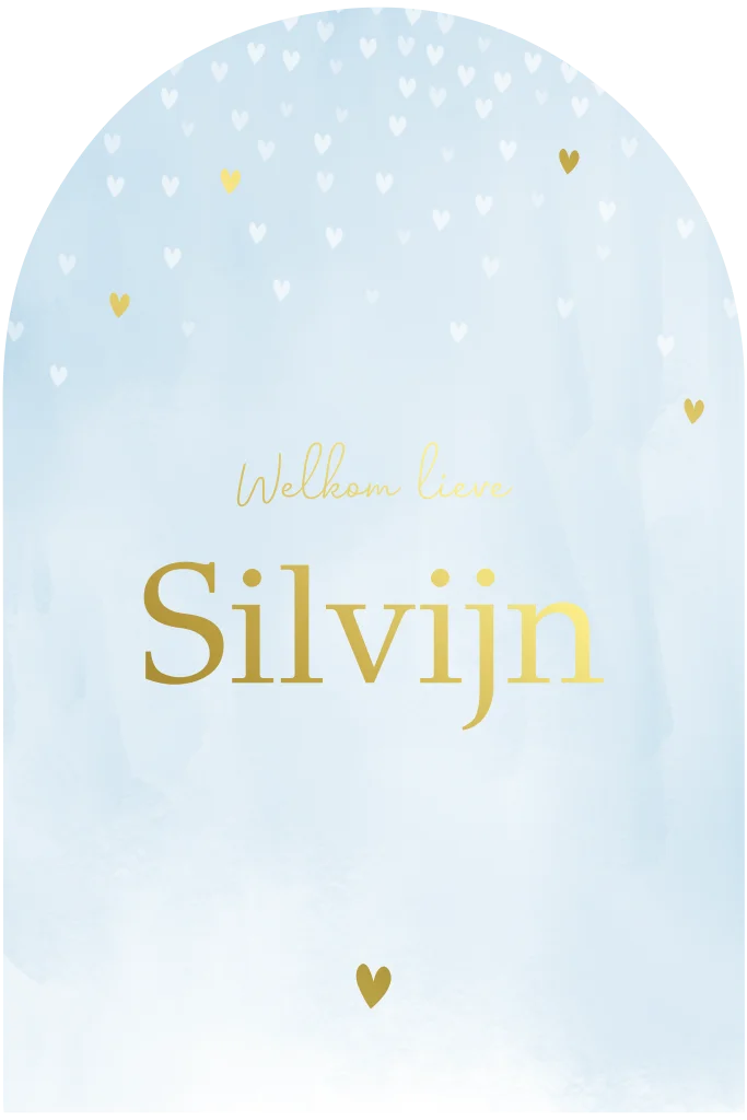 Een enkel geboortekaartje met zowel op de voorkant als de achterkant goudfolie. De voorkant heeft een waterverflook en hartjes.