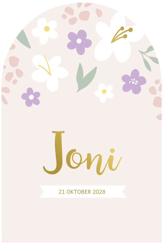 Een geboortekaartje met een bijzondere vorm, foliedruk en leuke bloemen.