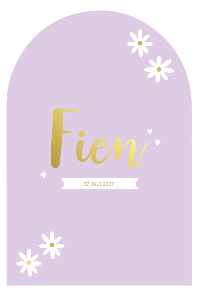 Lila geboortekaartje boogvorm en getekende bloemetjes