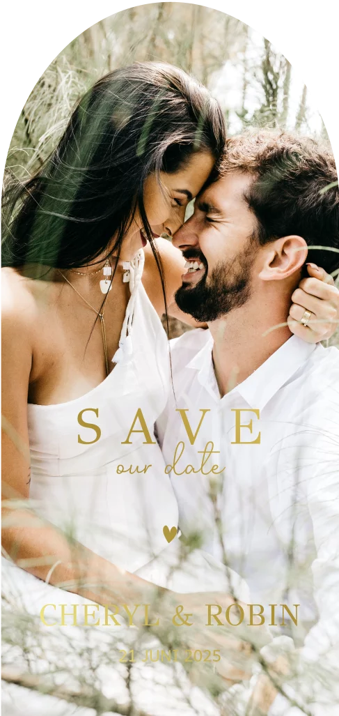 Een enkele, gestanste save the date kaart met foto. Vervang de foto voor die van jullie zelf en pas de rest van de kaart makkelijk aan in de editor. Op de achterkant is ruimte voor meer tekst.