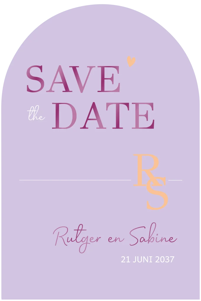 Een enkele save the date kaart met boogvorm. Het kaartje is afgewerkt met spotlak. Voor deze save the date is er ook een bijpassende trouwkaart.