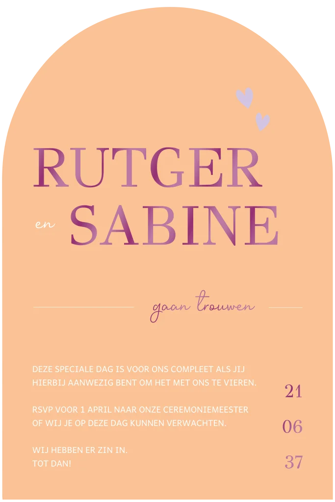 Een enkele trouwkaart met een stansvorm en foliedruk. Op de achterkant van de kaart staan de details.