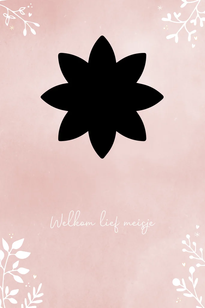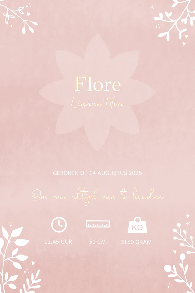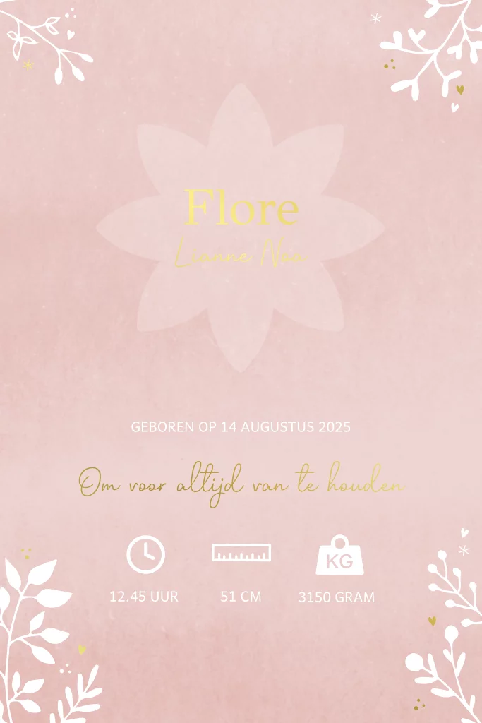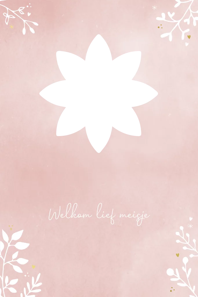 Een rechthoekig, gevouwen geboortekaartje met op de voorkant een uitsnede in de vorm van een bloemetje. Het kaartje is afgewerkt met goudfolie en is geheel naar wens aan te passen.