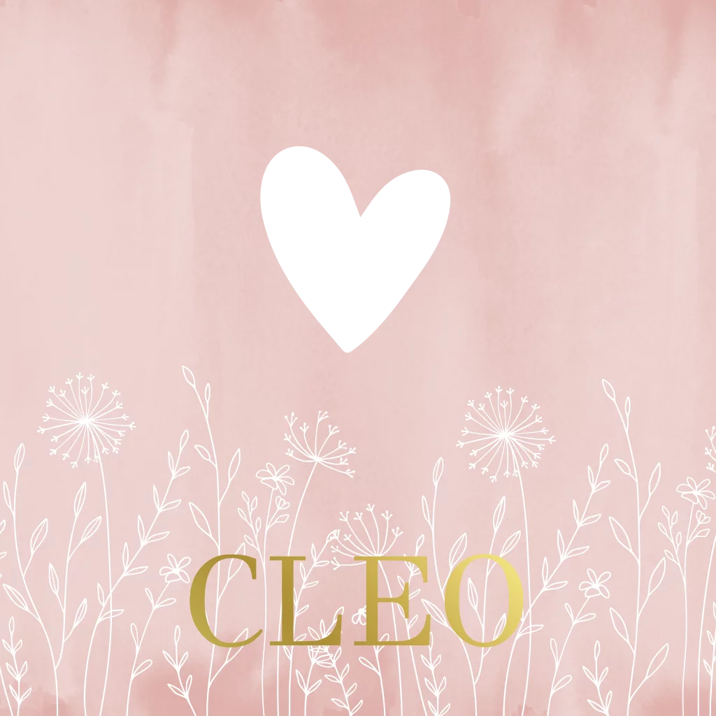 Een vierkant gevouwen geboortekaartje met op de voorkant een opening in de vorm van een hartje. Aan de binnenkant kun je de afbeelding vervangen door een foto van jouw pasgeboren kindje.