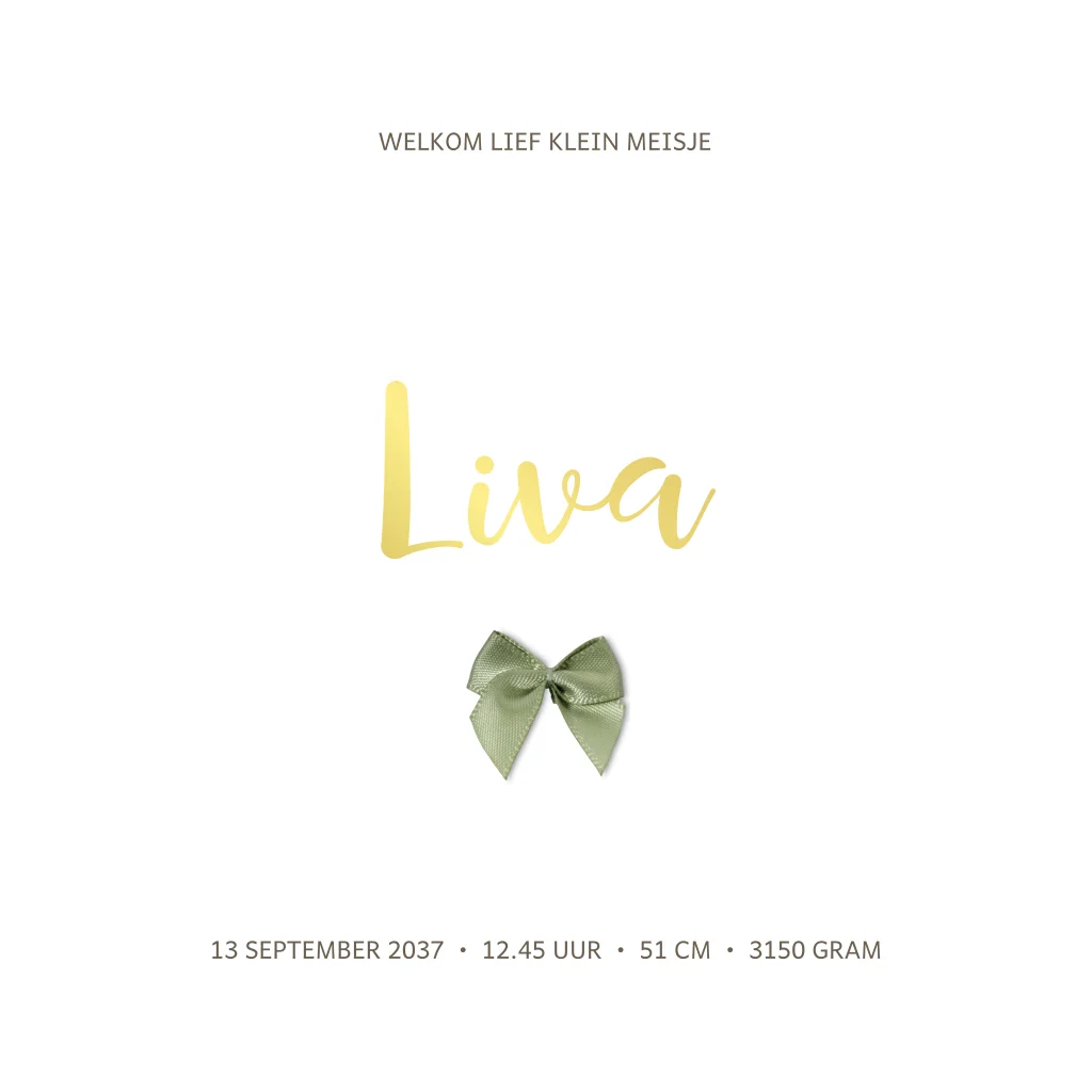 Een vierkant gevouwen geboortekaartje met op de voorkant een opening. Hierdoor zie je een gedeelte van de binnenkant waar een echt strikje zit. LET OP: Het strikje zit niet bij het kaartje en moet je dus apart bestellen. Deze vind je in meerdere kleuren op de pagina 'Extra's'.