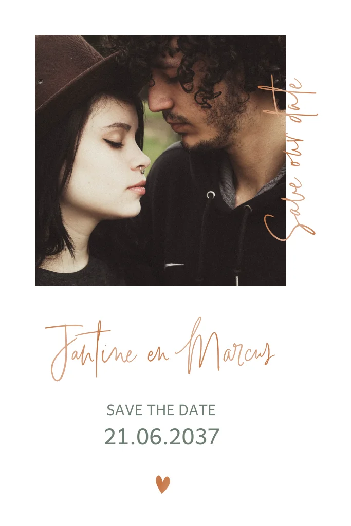 Een enkel save the date kaartje met aan 1 kant een gegolfde afwerking. De kaart heeft koperfoliedruk en de foto kan vervangen worden.