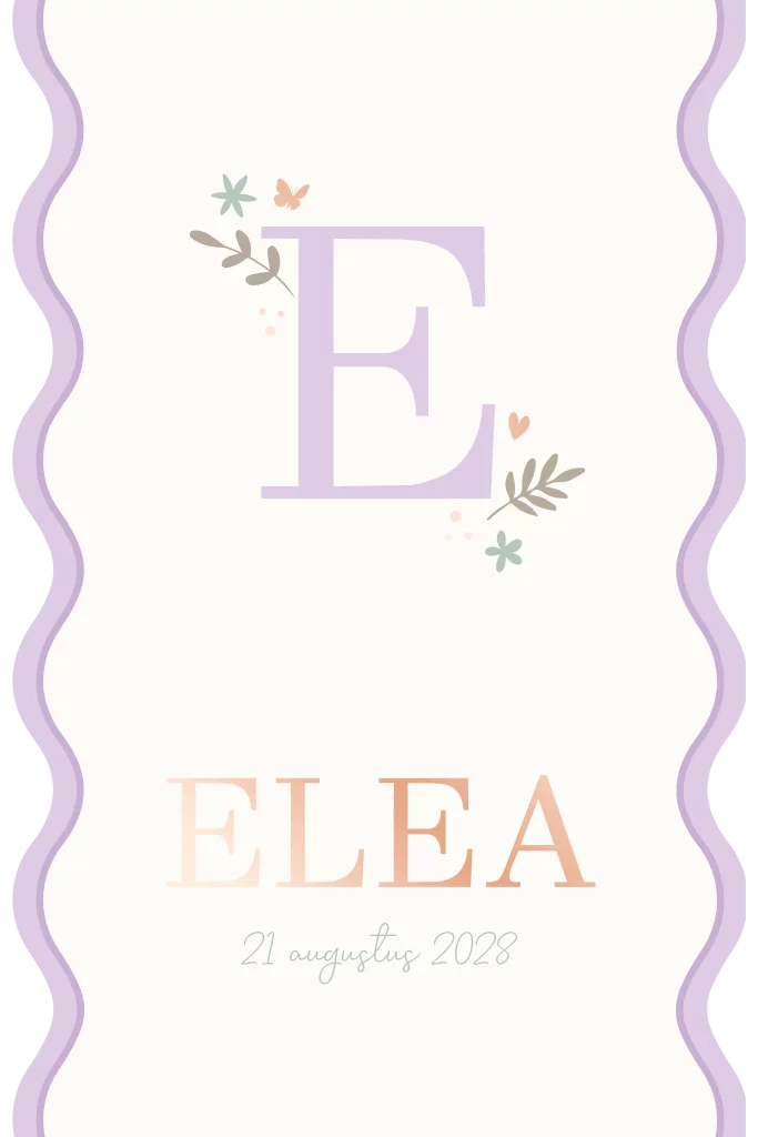 Een lief geboortekaartje voor meisjes. Het geboortekaartje heeft een golfrandje en is afgewerkt met gouden foliedruk. Op de voorkant staat een initiaal. De achterzijde bevat genoeg ruimte voor extra tekst. Het hele ontwerp is naar wens aan te passen.