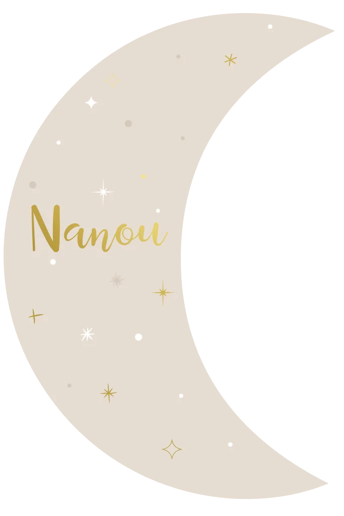 Een enkel geboortekaartje in de vorm van een maan. Het kaartje is afgewerkt met foliedruk.