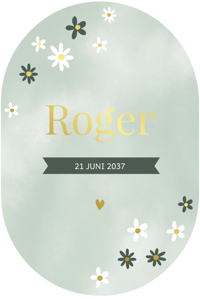 Een ovaal, enkel geboortekaartje met op de voorkant handgetekende bloemen en takjes. Het kaartje is afgewerkt met goudfolie. Het gehele kaartje kun je naar wens aan (laten) passen.