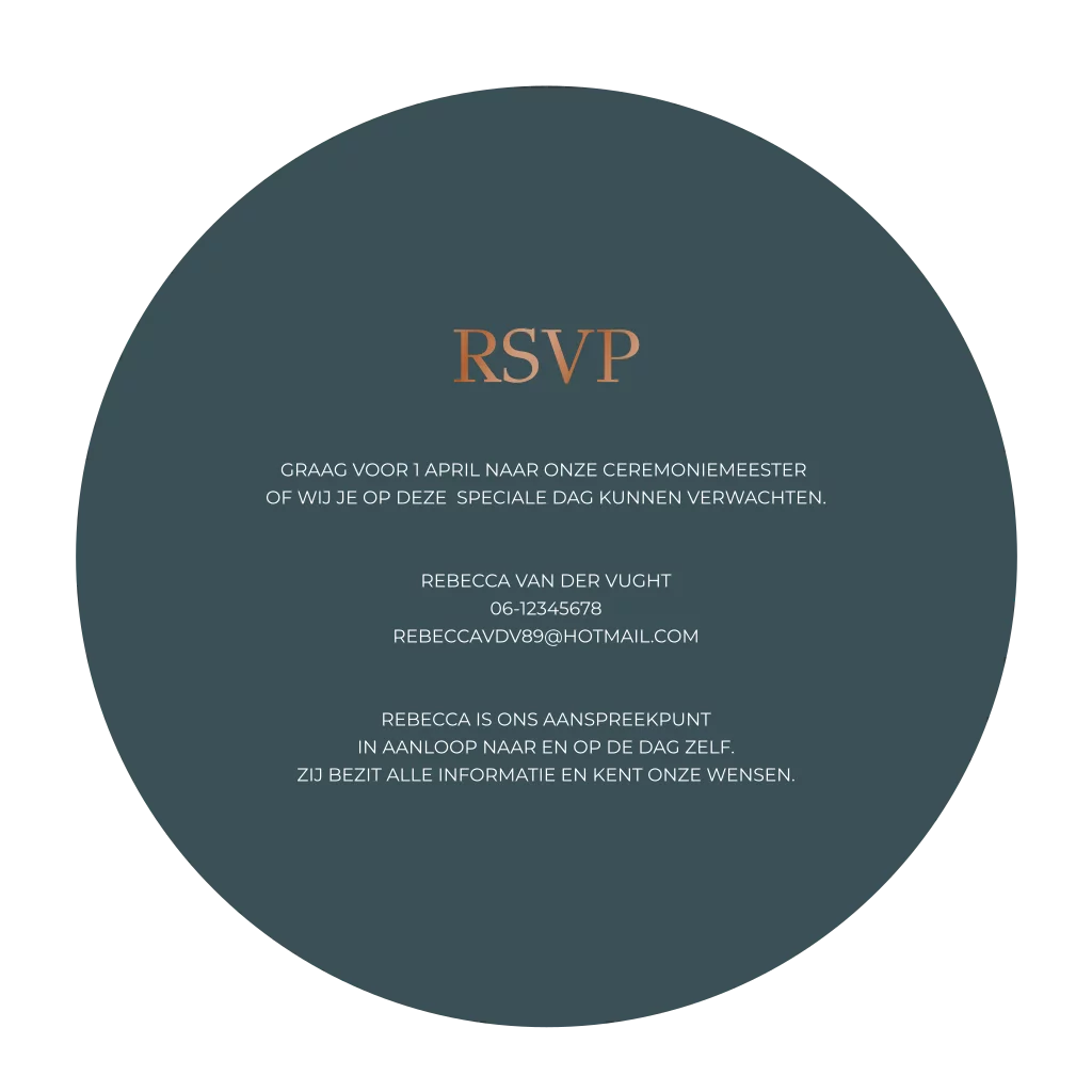 Dit ronde RSVP kaartje kun je zelf makkelijk aanpassen in de editor. De achterkant is leeg waar je meer tekst zou kunnen plaatsen.