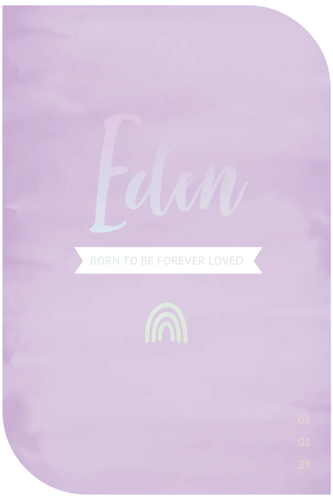 Een enkel geboortekaartje met 2 ronde hoeken en holografische folie op de voor- en achterkant. Het kaartje kun je naar wens aan (laten) passen.