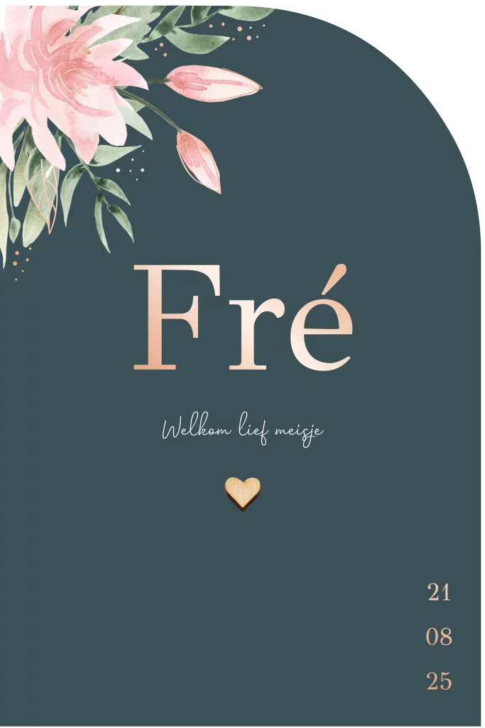 Een origineel geboortekaartje met 1 grote ronde hoek. Op de voorkant heeft net kaartje een echt houten hartje, deze dien je zelf apart mee te bestellen (als setje van 25 stuks of als sample voor de proefdruk). Het geboortekaartje is aan beide kanten afgewerkt met foliedruk.