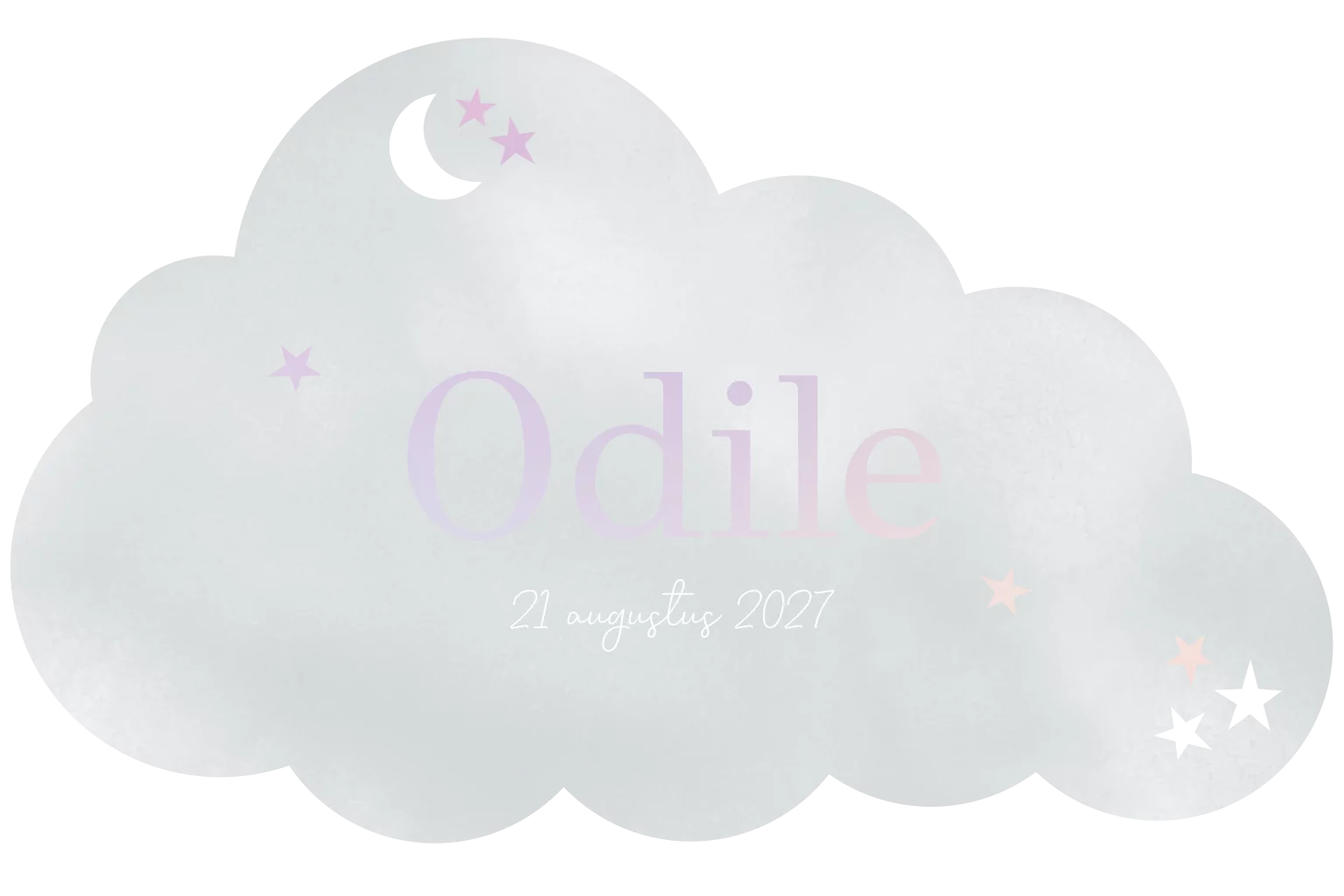 Een enkel, gestanst geboortekaartje in de vorm van een wolkje. Het kaartje heeft kleine openingetjes in de vorm van een maantje en sterretjes. Aan beide kanten is het kaartje afgewerkt met holografische foliedruk.