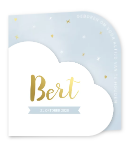 Vierkant geboortekaartje met wolkjes stans en rond hoekje. Dit originele kaartje is perfect voor de aankondiging van de geboorte van jullie zoontje. Het schattige wolkje voegt een vleugje liefde toe aan het ontwerp, waardoor het kaartje een unisex uitstraling heeft. De stans in de vorm van een wolkje maakt dit geboortekaartje extra speciaal en zorgt ervoor dat het opvalt tussen alle andere kaartjes.