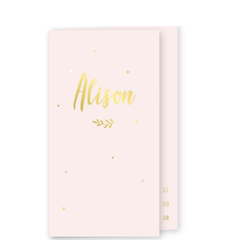Lief geboortekaartje met smalle voorkant, stipjes, takje en foliedruk