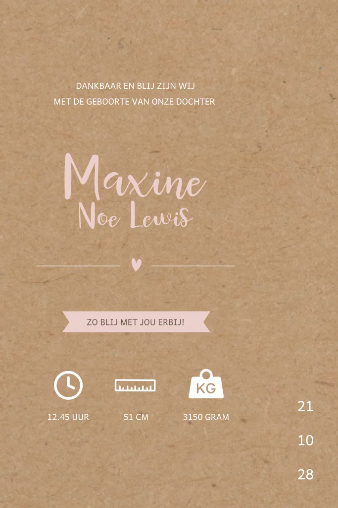 Geboortekaartje smalle voorkant, roze tinten en kraft binnenkant