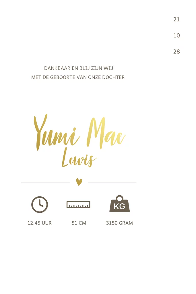Een uniek geboortekaartje met een smalle voorkant, afgewerkt met foliedruk. Het kaartje is geheel naar wens aan te passen.