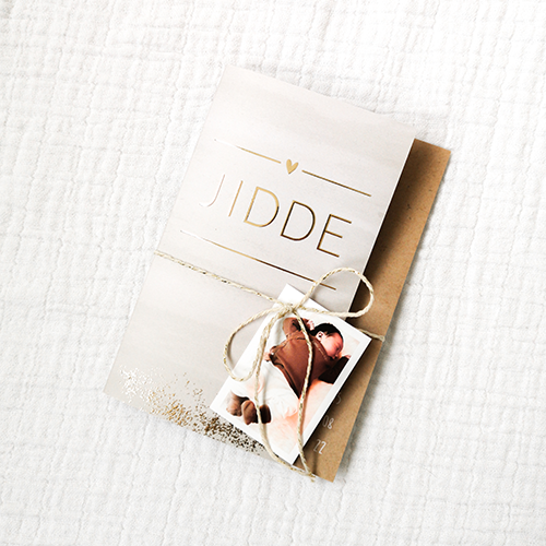 Een uniek geboortekaartje met een smalle voorkant, afgewerkt met foliedruk. Het kaartje is geheel naar wens aan te passen.