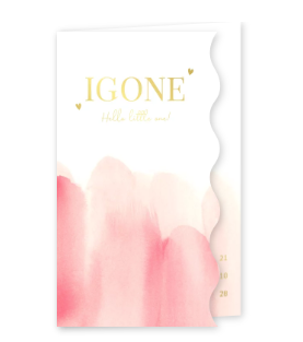 Geboortekaartje met smalle voorkant, golfrandje en roze waterverf