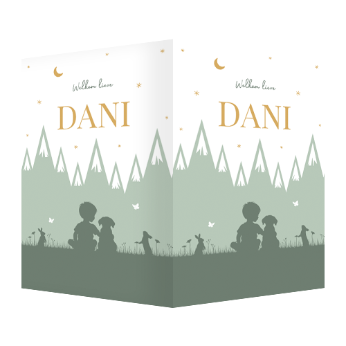 Een lief geboortekaartje met bergen. Pas het ontwerp aan naar wens in onze online editor.