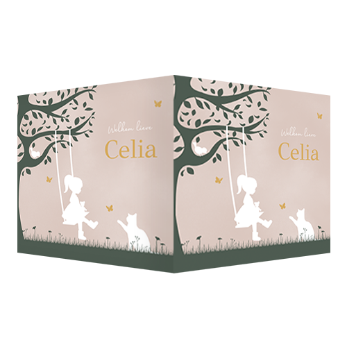 Raambord meisje op schommel met kat