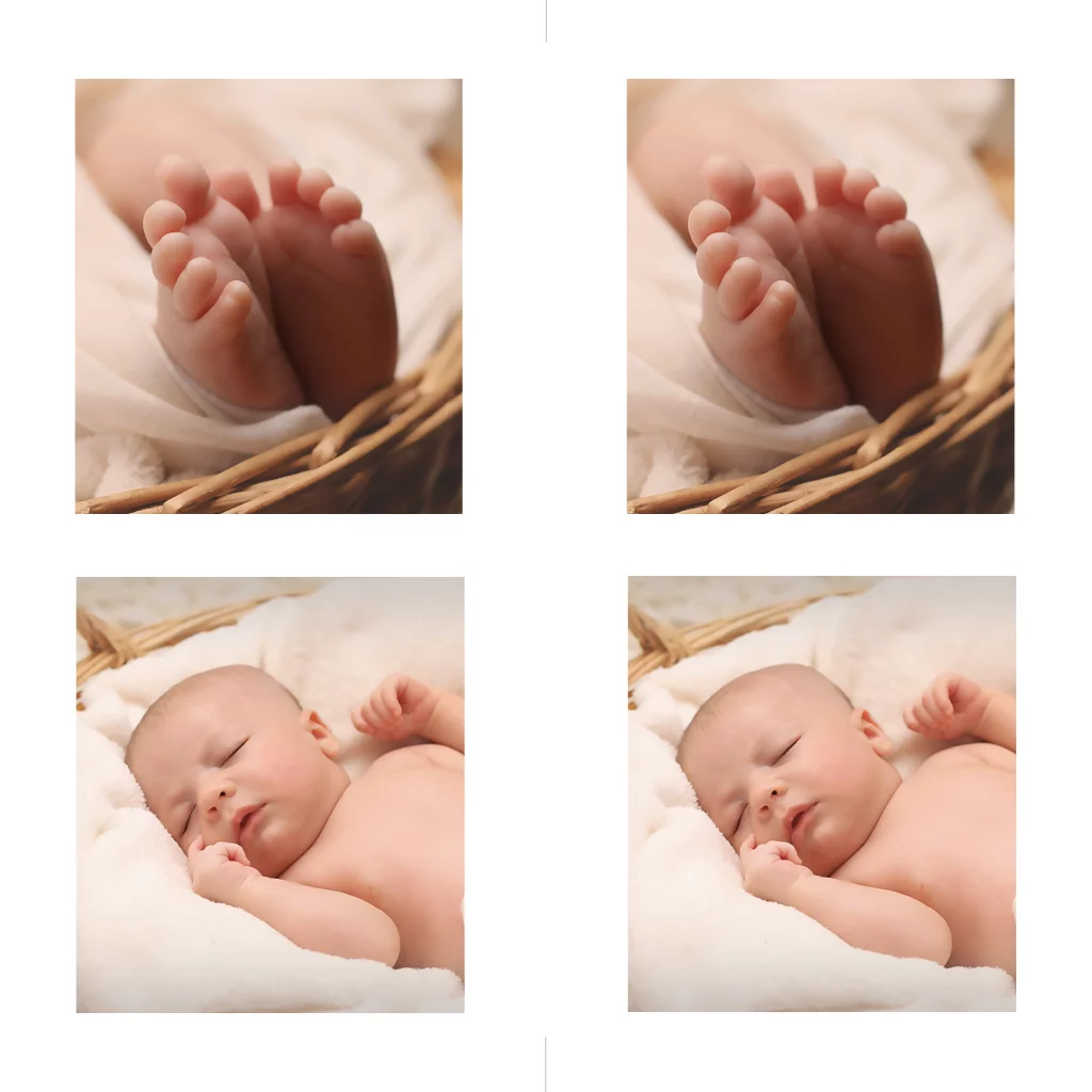 Een enkele kaart met daarop 2 kleine fotostrips. Vervang de afbeeldingen voor een foto van jullie pasgeboren kindje en snij de kaarten met een scherp mesje los van elkaar.
