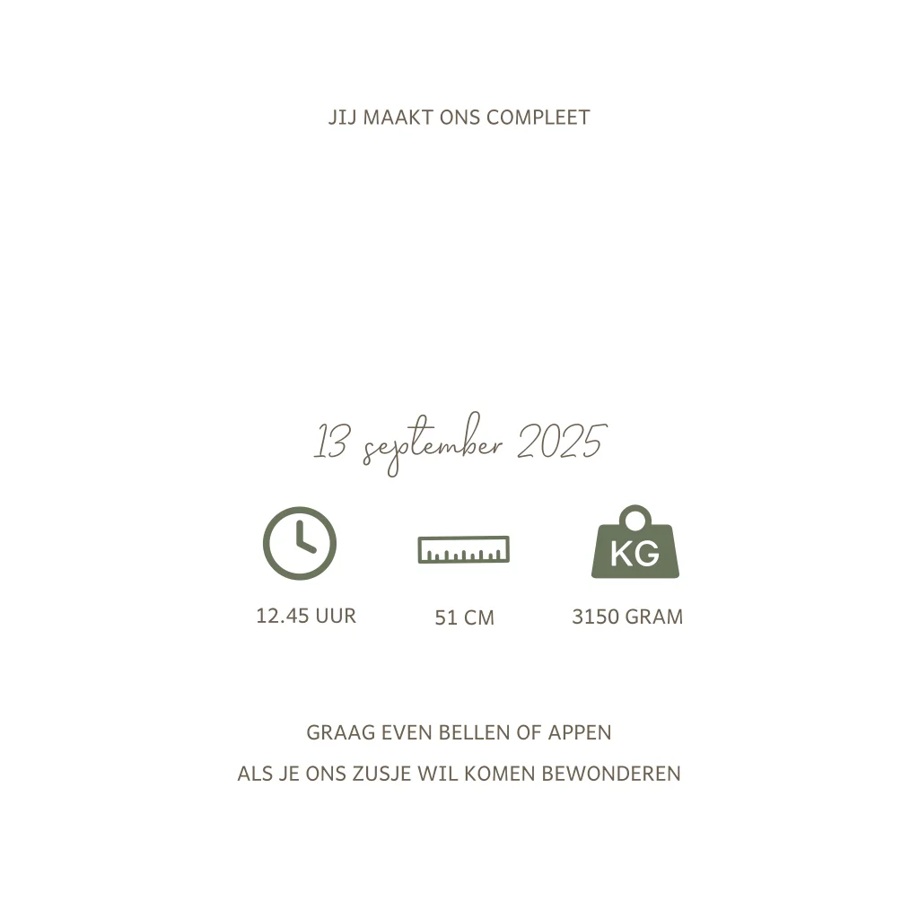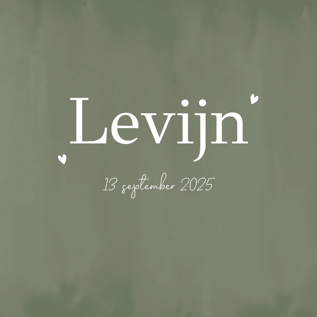 Dit rustige geboortekaartje heeft ruimte in de binnenkant voor extra tekst of een foto. De kleuren kun je gemakkelijk aanpassen in de editor.
