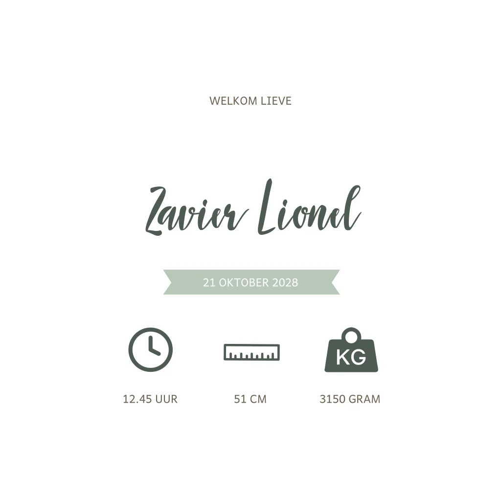 Een vierkant gevouwen geboortekaartje voor jongens in groene kleuren. Het kaartje heeft organische vormen en takjes.