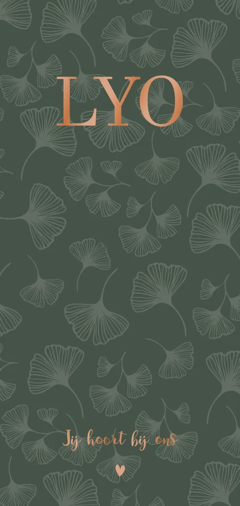 Een langwerpig geboortekaartje met patroon van genkoblaadjes en koperfolie. Je kunt de kleuren zelf eenvoudig aanpassen als je de kaart gaat bewerken. Villa Pluis ontwerpt écht unieke en originele geboortekaartjes, die je niet zo snel ergens anders zal vinden. Alle kaartjes zijn naar wens aan te passen. Dit kun je zelf doen met de handige online ontwerp editor, maar wij kunnen je ook (gratis) helpen. Bestel daarna snel een proefdruk om het kaartje in het echt te zien!