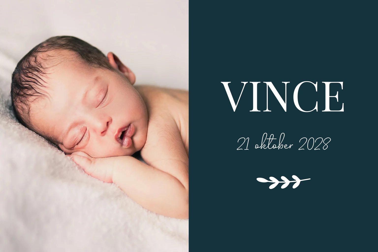 Een geboortekaartje met een foto, afgewerkt met foliedruk. Het kaartje is geheel naar wens aan te passen.