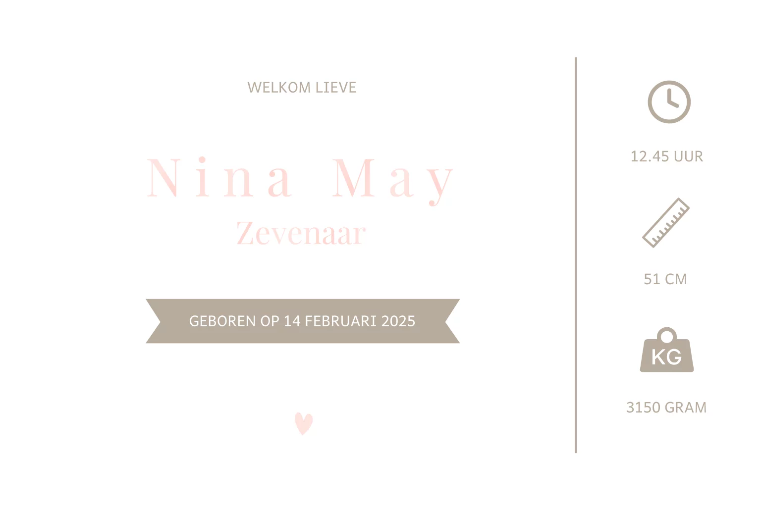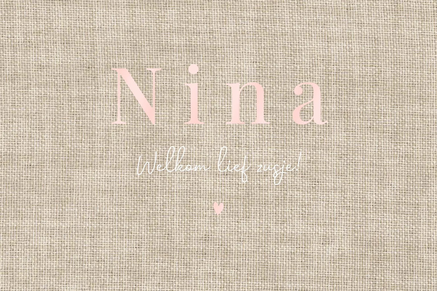 Een rechthoekig gevouwen geboortekaartje met linnenlook en spot UV lak. In de editor kun je het ontwerp naar wens aanpassen.