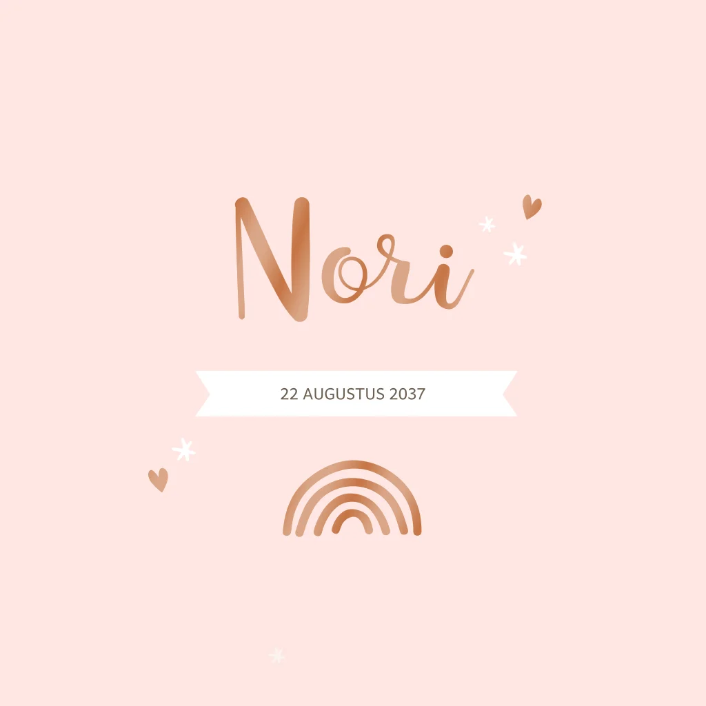 Dit vierkante gevouwen geboortekaartje met regenboog kun je zelf aanpassen in de editor. Voeg extra tekst toe of verander de kleur van de tekst.