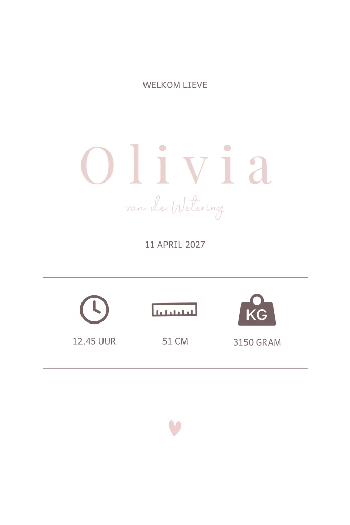 Een rechthoekig geboortekaartje met roze kleur en handgetekende geboortebloem. In de editor kun je het ontwerp naar wens aanpassen.