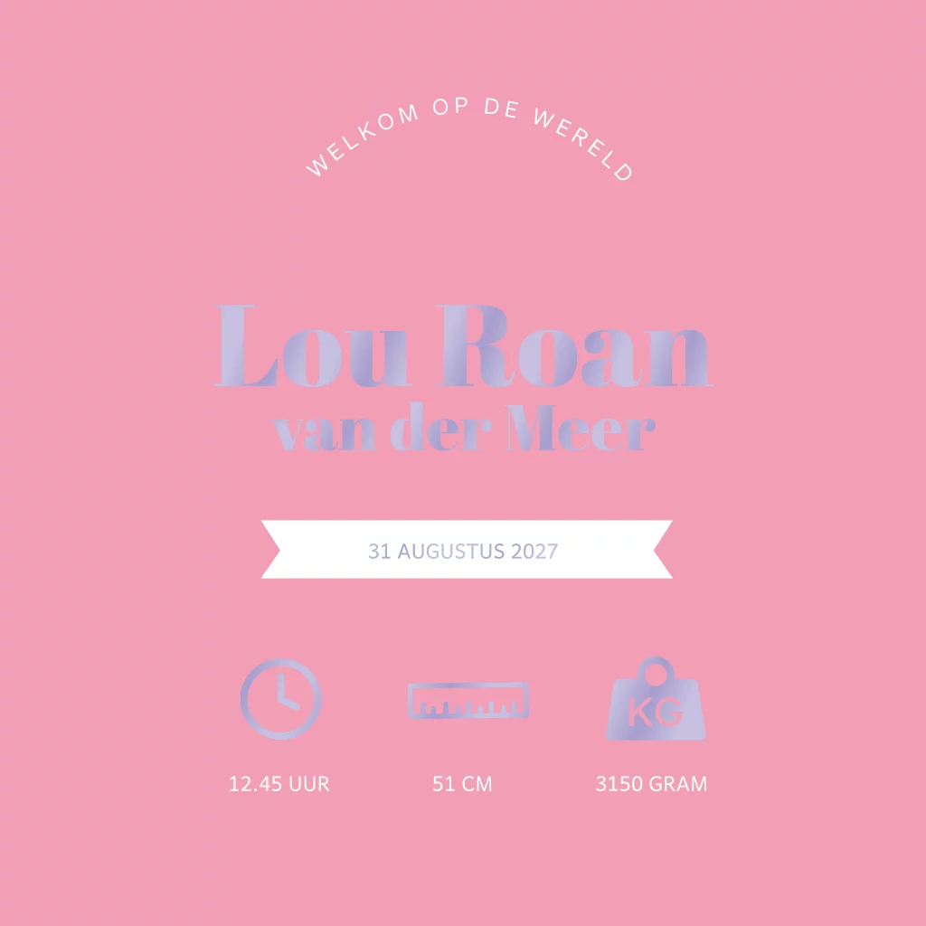 Kleurrijk geboortekaartje met hoogglans letters en zomerse uitstraling.