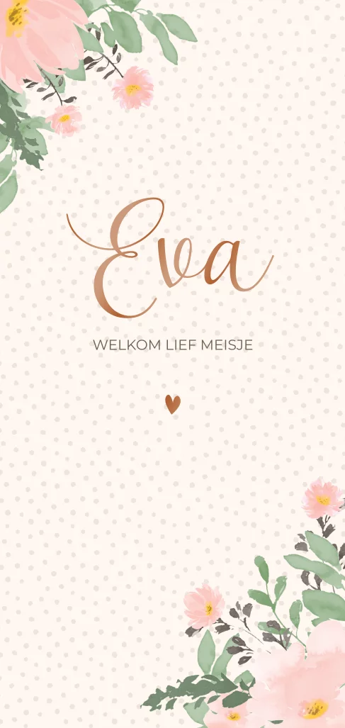 Een langwerpig geboortekaartje met bloemen van waterverf, stipjes en koperfolie. De kleur van de folie kun je naar wens aanpassen.