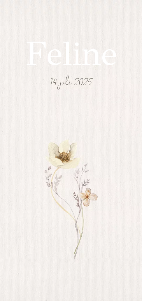 Een langwerpig, enkel geboortekaartje met ronde hoeken. Op de voorkant heeft het kaartje veldbloemen die gemaakt zijn met waterverf. De voor- en achterkant zijn voorzien van rosefolie. Villa Pluis ontwerpt écht unieke en originele geboortekaartjes, die je niet zo snel ergens anders zal vinden. Alle kaartjes zijn naar wens aan te passen. Dit kun je zelf doen met de handige online ontwerp editor, maar wij kunnen je ook (gratis) helpen. Bestel daarna snel een proefdruk om het kaartje in het echt te zien!