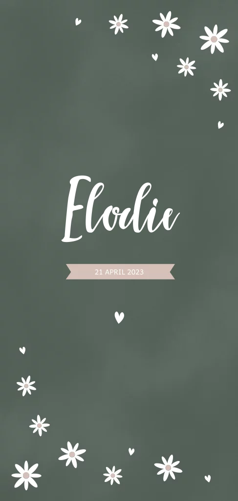 Wanneer je op zoek bent naar een uniek en mooi geboortekaartje, moet je zeker eens kijken naar dit kaartje met roze en groene bloemetjes. Het kaartje is langwerpig en uniek, en de foliedruk maakt het kaartje helemaal af. Het kaartje is naar wens aan te passen, dus je kunt het precies maken zoals je wilt. Het kaartje is gemaakt van stevig karton, en de bloemetjes zijn handgemaakt. Het kaartje is uniek, mooi, en stijlvol, en zal zeker opvallen tussen alle andere geboortekaartjes.