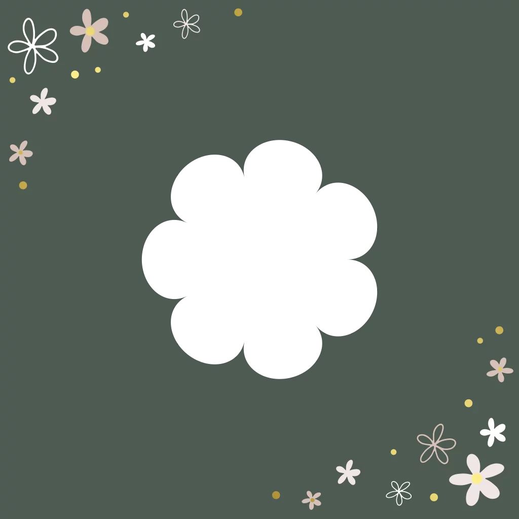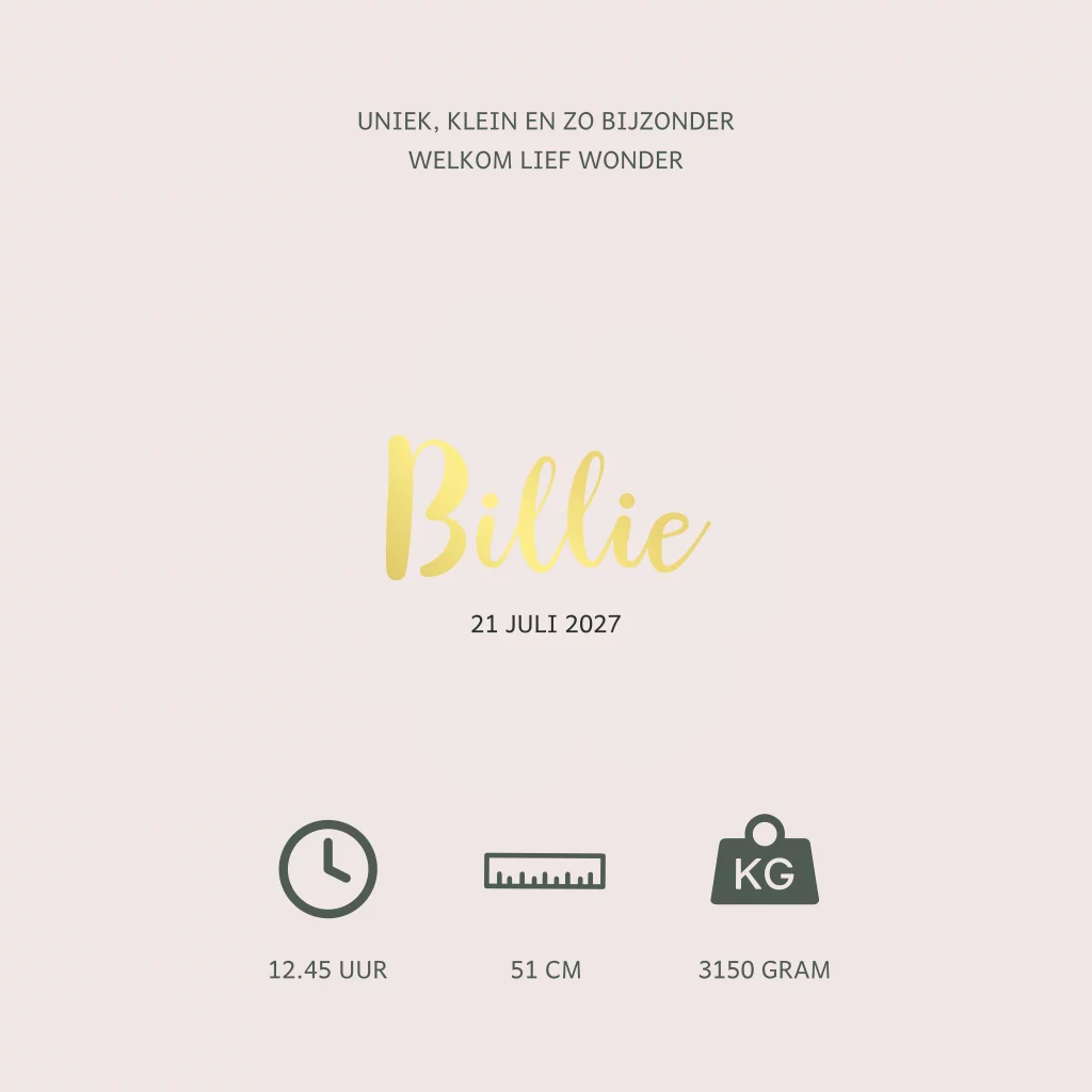 Een vrolijk, vierkant geboortekaartje. Het kaartje is gevouwen en heeft op de voorkant een stans in de vorm van een bloemetje, zodat je naar binnen kunt kijken. Het kaartje is aan beide kanten afgewerkt met foliedruk en is naar wens aan te passen.