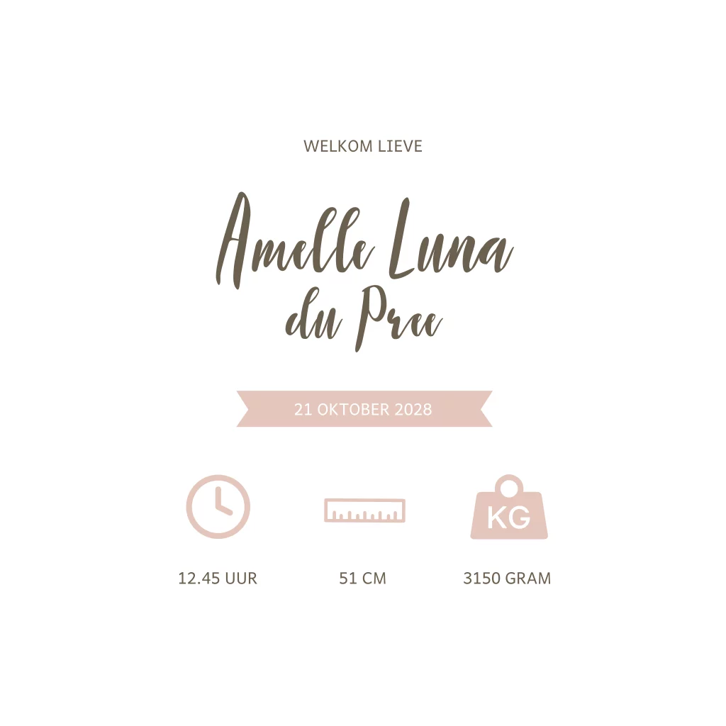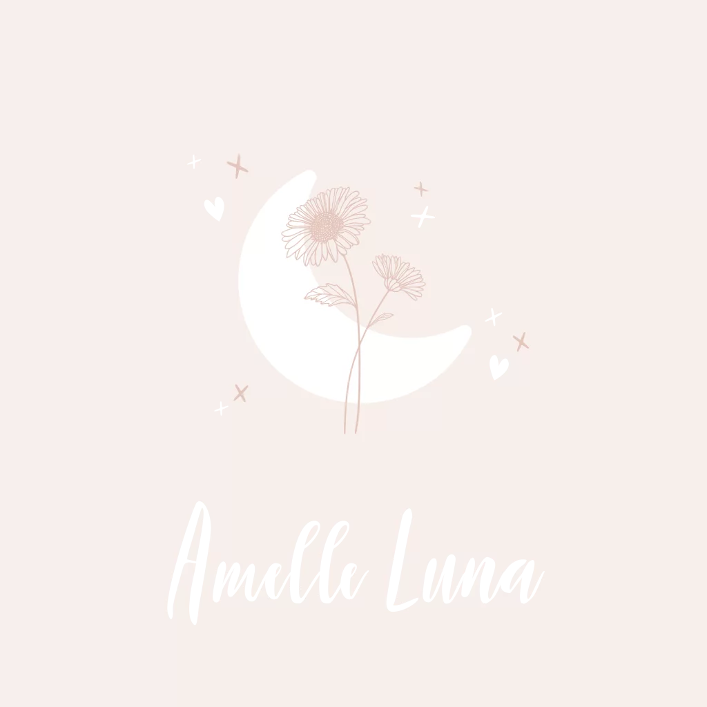 Een vierkant gevouwen geboortekaartje in roze tinten. Het kaartje heeft een maantje en een boektje en is afgewerkt met foliedruk.