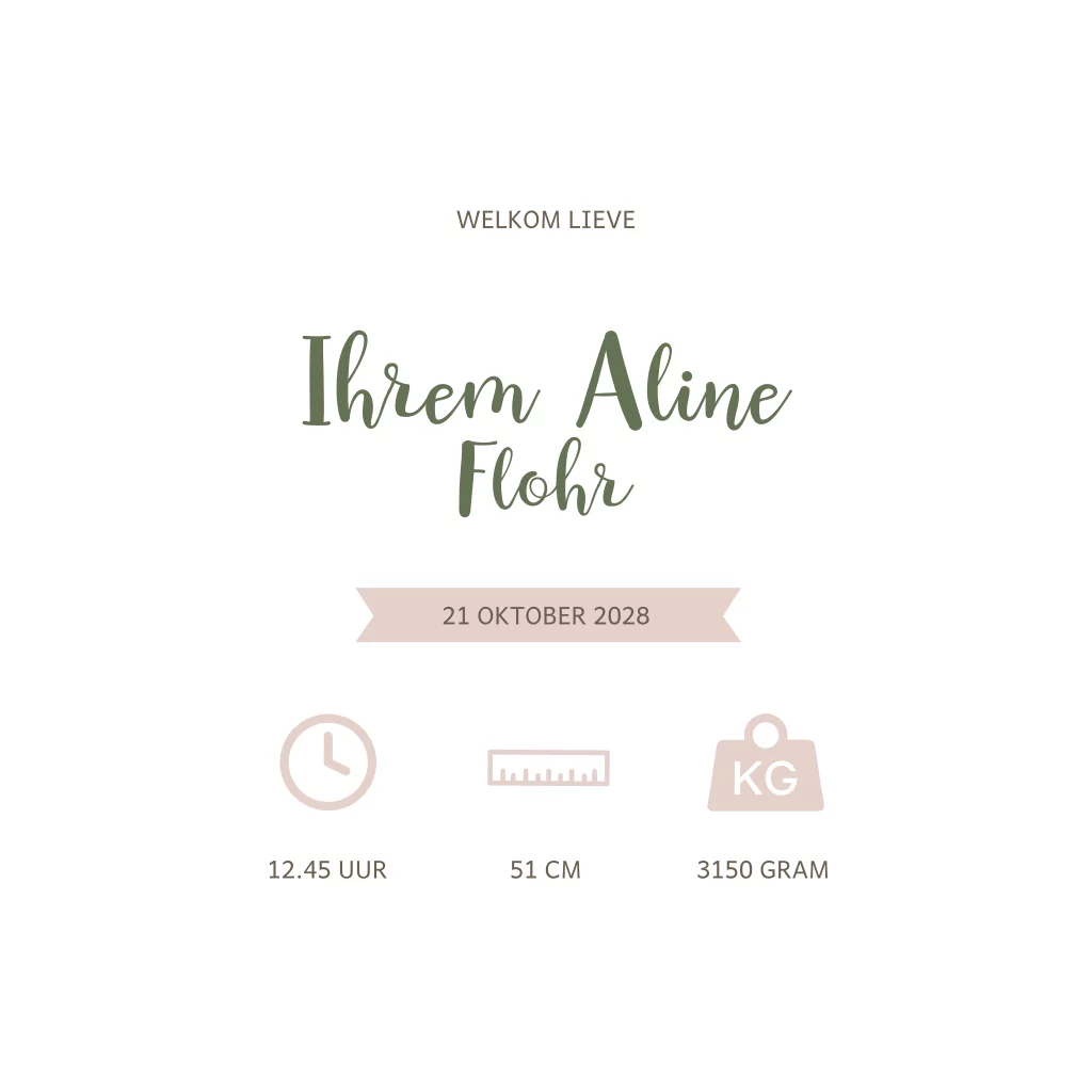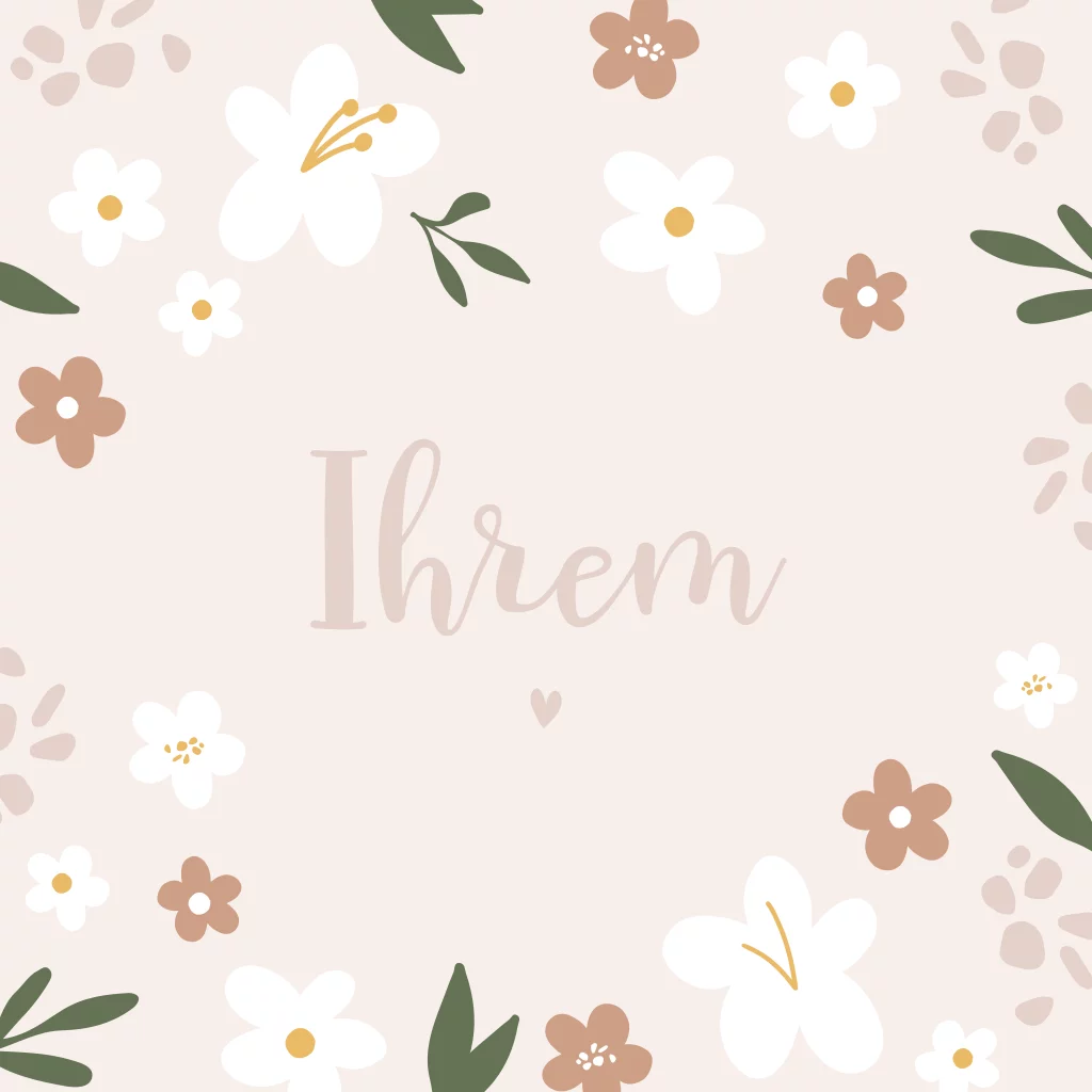 Een vrolijk geboortekaartje met handgetekende bloemetjes en neutrale kleuren. Het is een dubbel kaartje dat je neer kunt zetten.