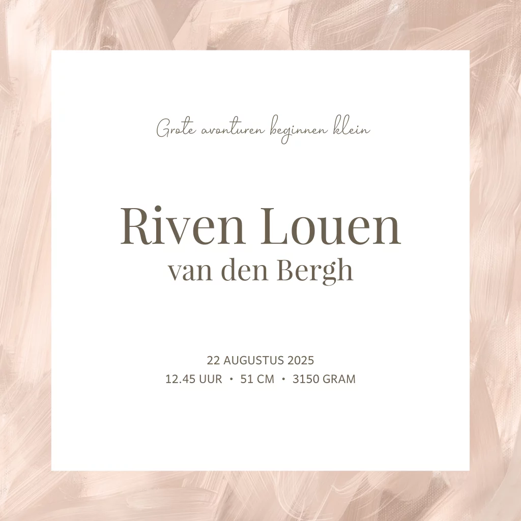 Dit vierkante gevouwen geboortekaartje met initiaal kun je zelf aanpassen in de editor. Voeg extra tekst toe of verander de kleur van de tekst.