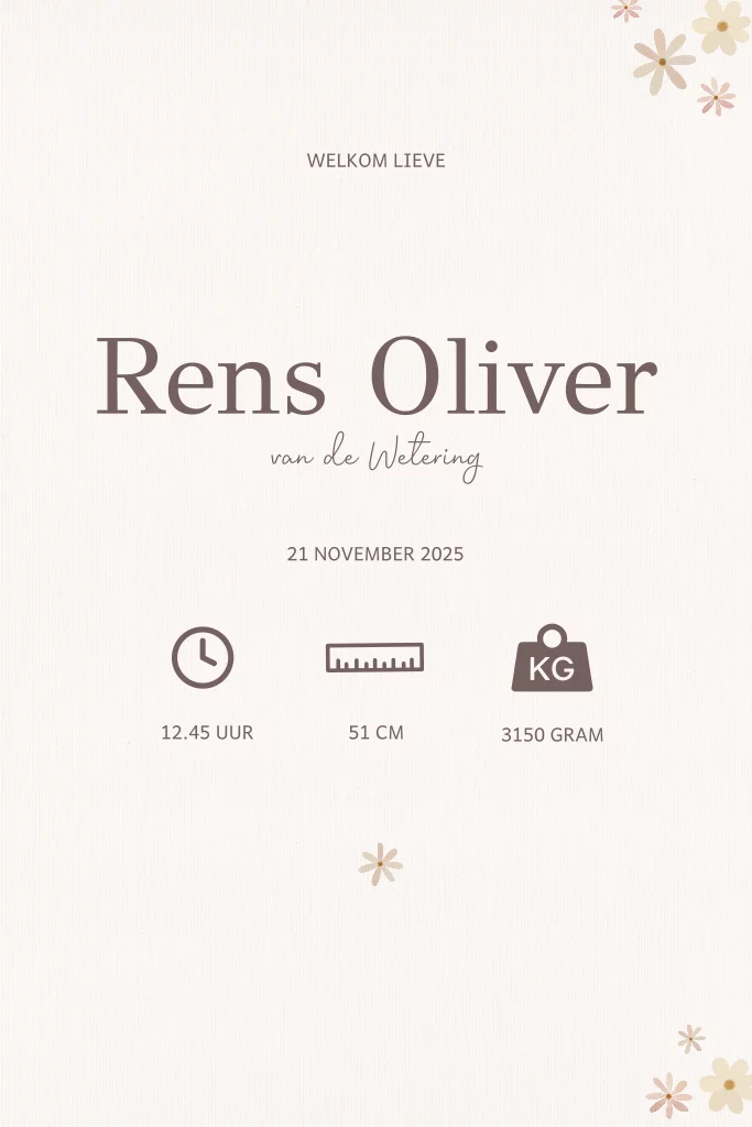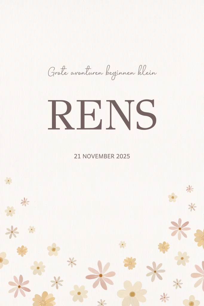 Geboortekaartje met zandkleur en getekende bloemetjes