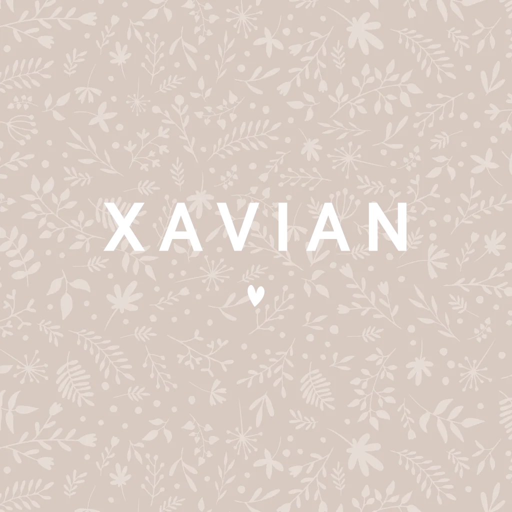 Een vierkant gevouwen geboortekaartje met blaadjespatroon en foliedruk. In de editor kun je het kaartje naar wens aanpassen.