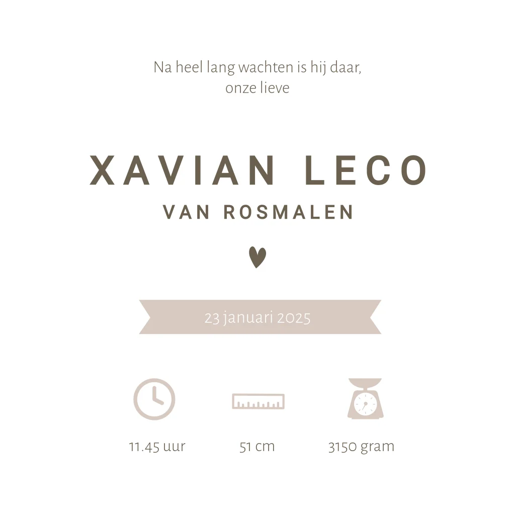 Alle geboortekaartjes zijn uit te breiden met mooie extra’s. Heb je een geboortekaartje uitgekozen met een touwtje/lintje, houten elementje, strikje en/of andere optionele extra’s? Dan mag je deze zelf apart mee bestellen via de pagina ‘Extra’s’. Deze onderdelen zitten niet standaard bij het geboortekaartje en zijn ook niet in de prijs meegerekend.