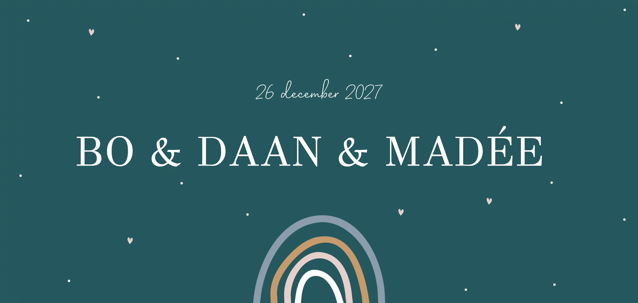 Een liggend, langwerpig geboortekaartje met een regenboog in verschillende kleuren. Het kaartje is aan de voorkant afgewerkt met rosefolie. Het kaartje is naar wens aan te passen en kan makkelijk in de editor aangepast worden naar een geboortekaartje voor 1 kindje. De kleuren van de regenboog zorgen ervoor dat het kaartje vrolijk en kleurrijk is, en de rosefolie geeft het kaartje een luxe uitstraling.