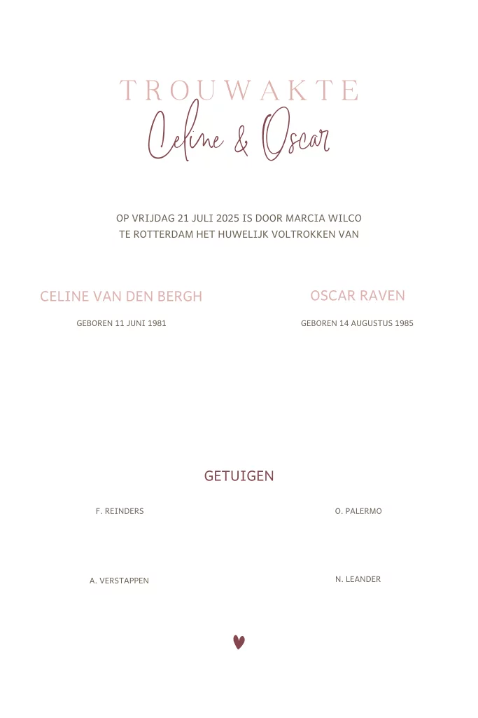 Een enkele trouwakte met roze en rode kleuren. De trouwakte is volledig naar wens aan te passen.