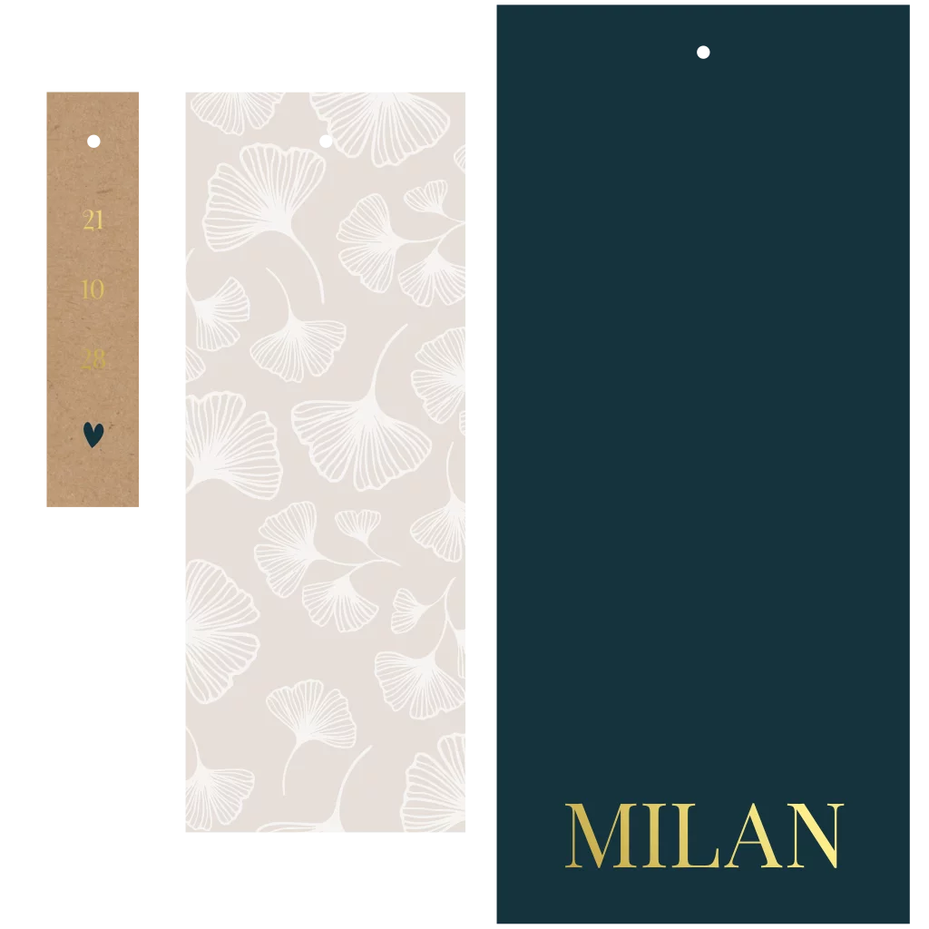 Driedelig geboortelabel voor jongens met blaadjesprint en foliedruk