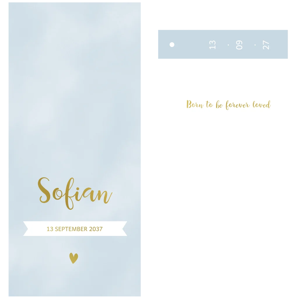Een langwerpig, enkel geboortekaartje met daaraan 2 losse labels. In de labels zitten gaatjes. Met een mooi touwtje of lintje kun je ze aan de kaart bevestigen.