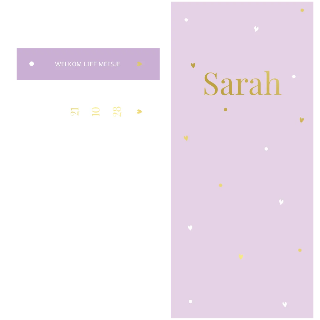 Een langwerpig geboortekaartje met lila kleuren. Het kaartje heeft twee losse tekstlabels welke voorzien zijn van een gaatje, zodat je er een mooi touwtje of lintje doorheen kunt doen. Het geboortekaartje is afgewerkt met foliedruk.